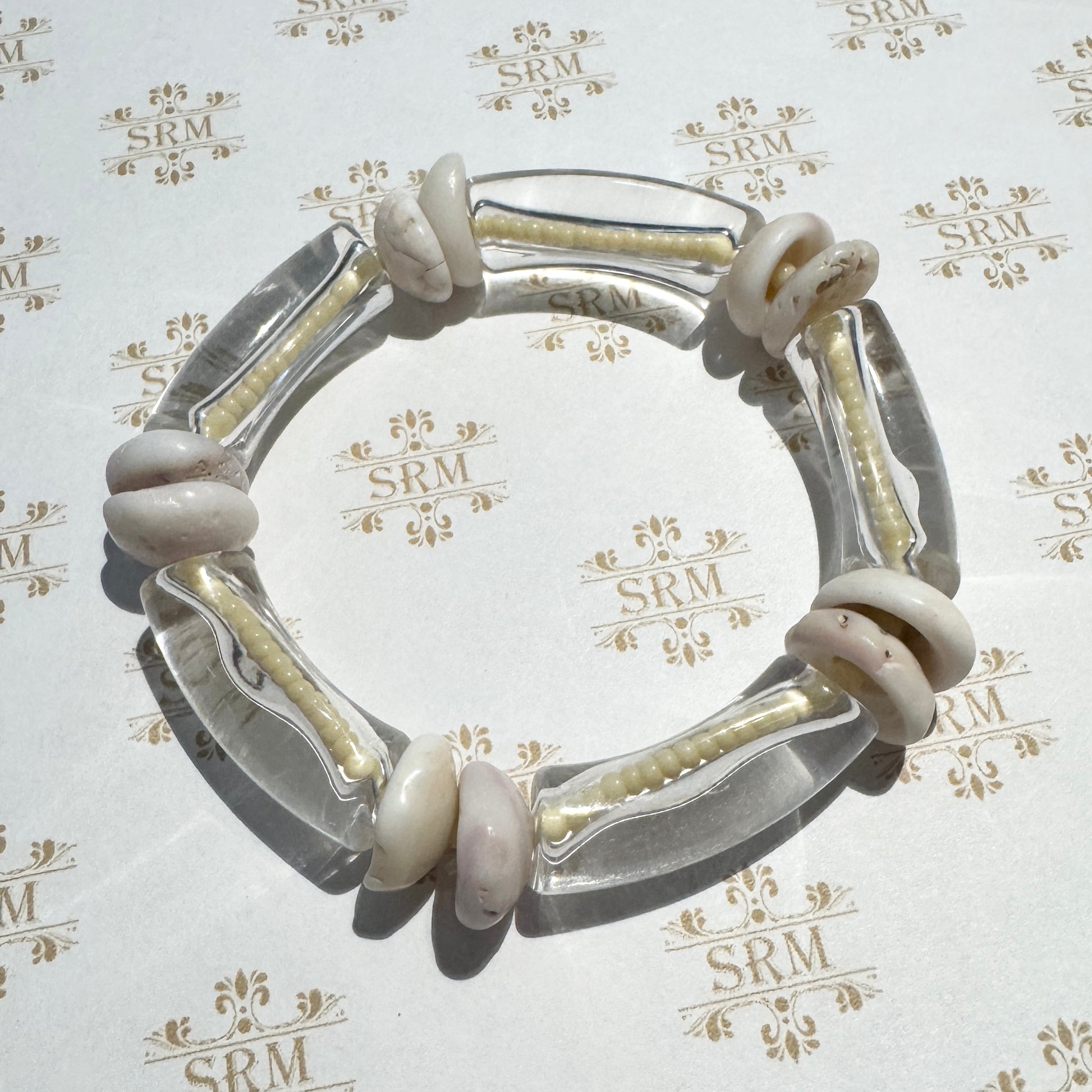 Handmade bracelet composed of clear acrylic tubes, puka shells and seed beads inside the acrylic tubes.