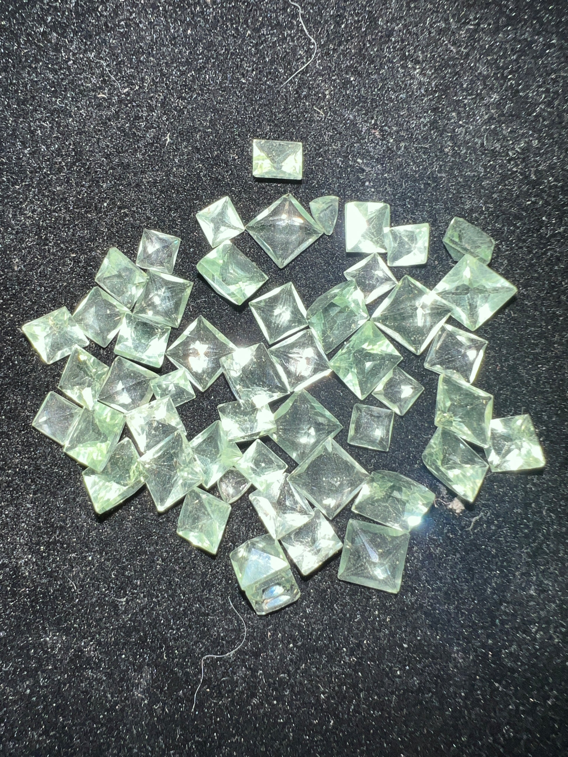 Choice of size. All weights and sizes are approximate. Approximately 4mm to 6.5mm each side. Princess cut. UV fluorescent. Our picture is for show only. Item sent will be our choice and very very similar. White sticker behind every piece for stability in the holder. Remove the white sticker after opening. Search google for “uranium glass” to see where these were cut from. There is a color range for this glass from light yellow/green… to green under visible light. These are green under UV… see the first picture. Any blue you see under UV is a reflection from the white sticker/background.