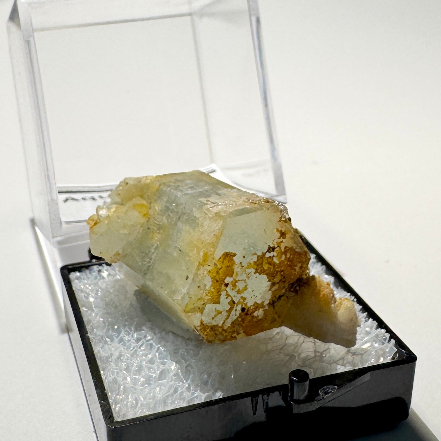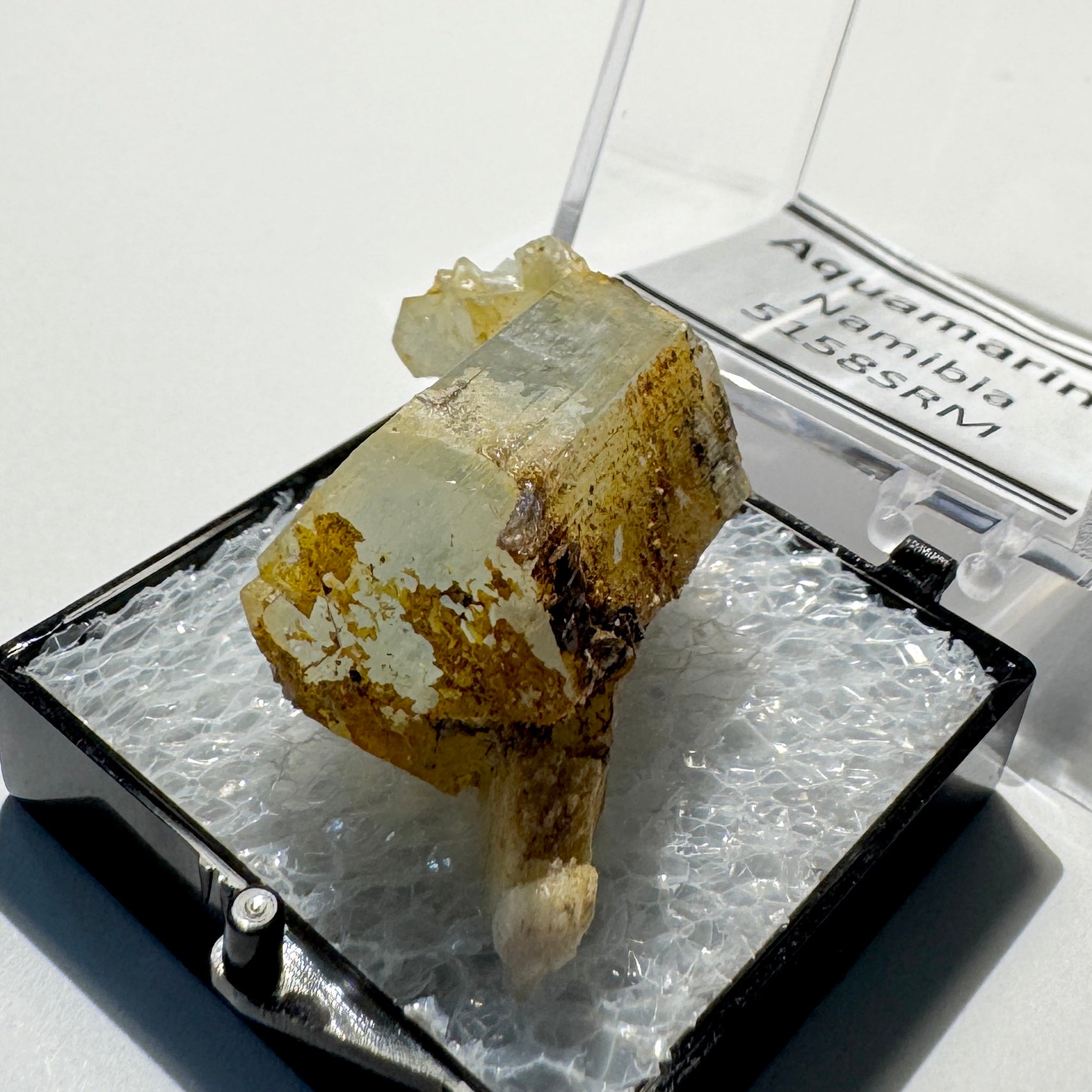 Natural Aquamarine from Namibia with some dusting of Feldspar. Approximately 1.25" x .75" x .5". 9.72 grams. Mounted in a 1.25" specimen box.