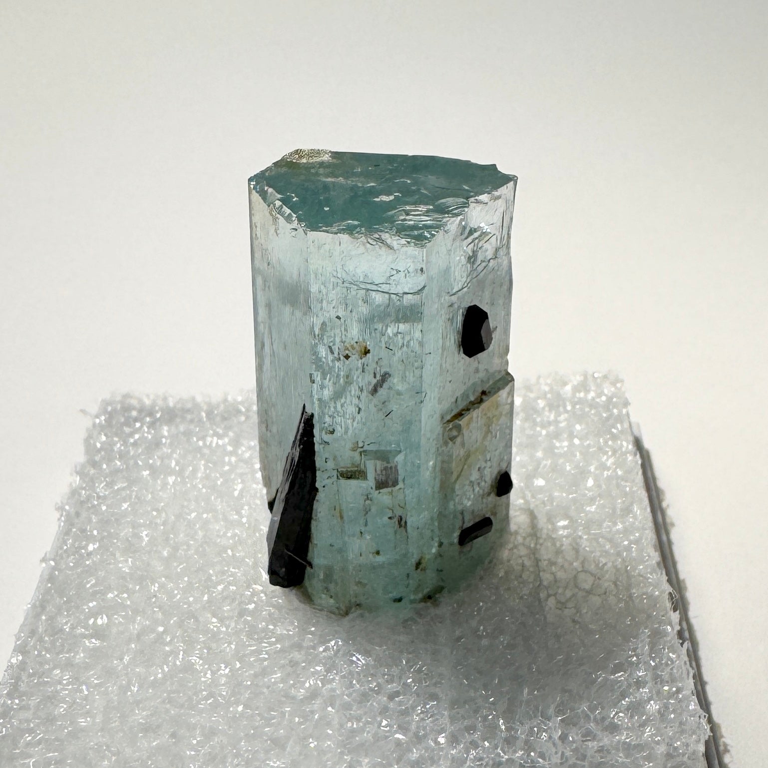 Natural Aquamarine with a bit of Feldsar and Shorl. Crystal is from Namibia. Approximately 1.25" x .75" x .7". 15.69 grams. Mounted in a 2" specimen box.