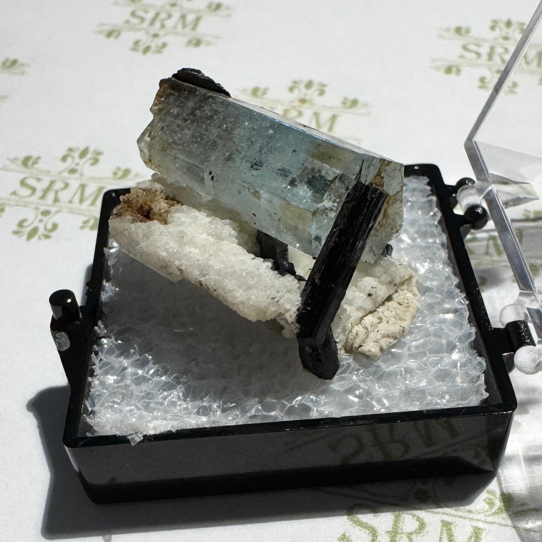 Crystal : Mounted : Natural Aquamarine with Tourmaline inclusions and Feldspar, 5¾g, Namibia