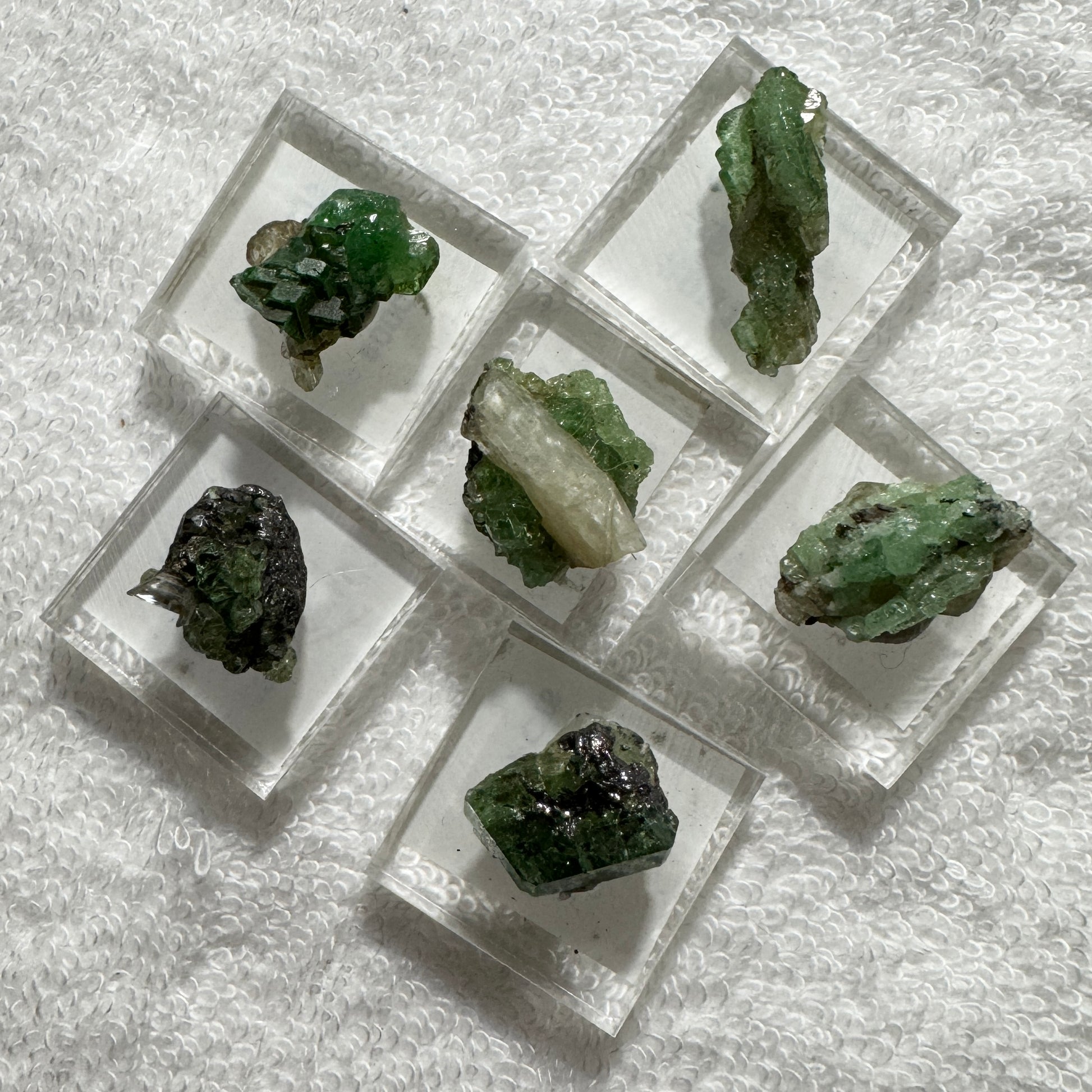 Green Garnet, Tsavorite, crystals mounted on 1” acrylic bases using museum putty. Weights vary from about 12 carats to about 21 carats.