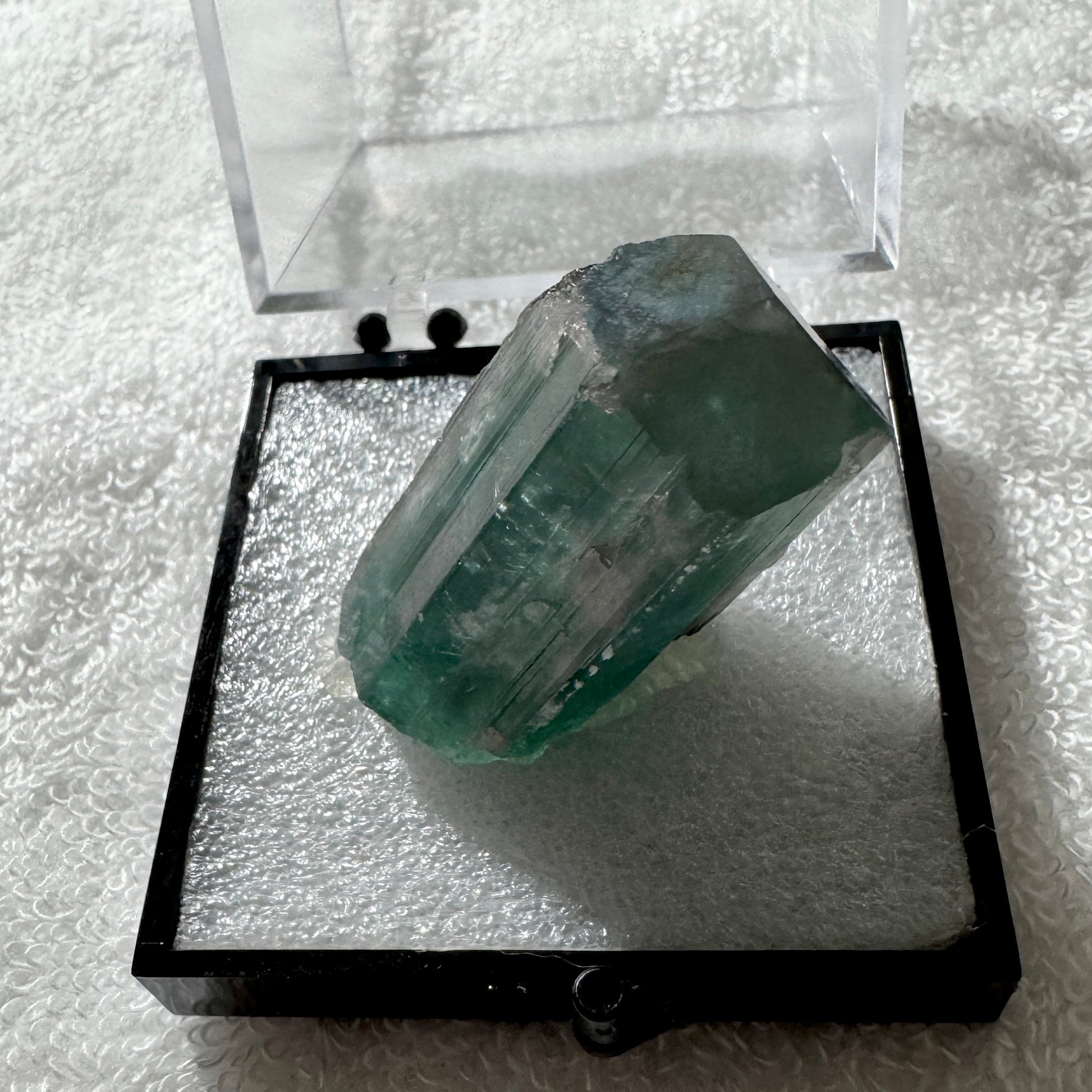 Watermelon Tourmaline crystal mounted in 2” acrylic box. Crystal measures 36mm x 24mm x 19mm and weighs 139.30 carats.
