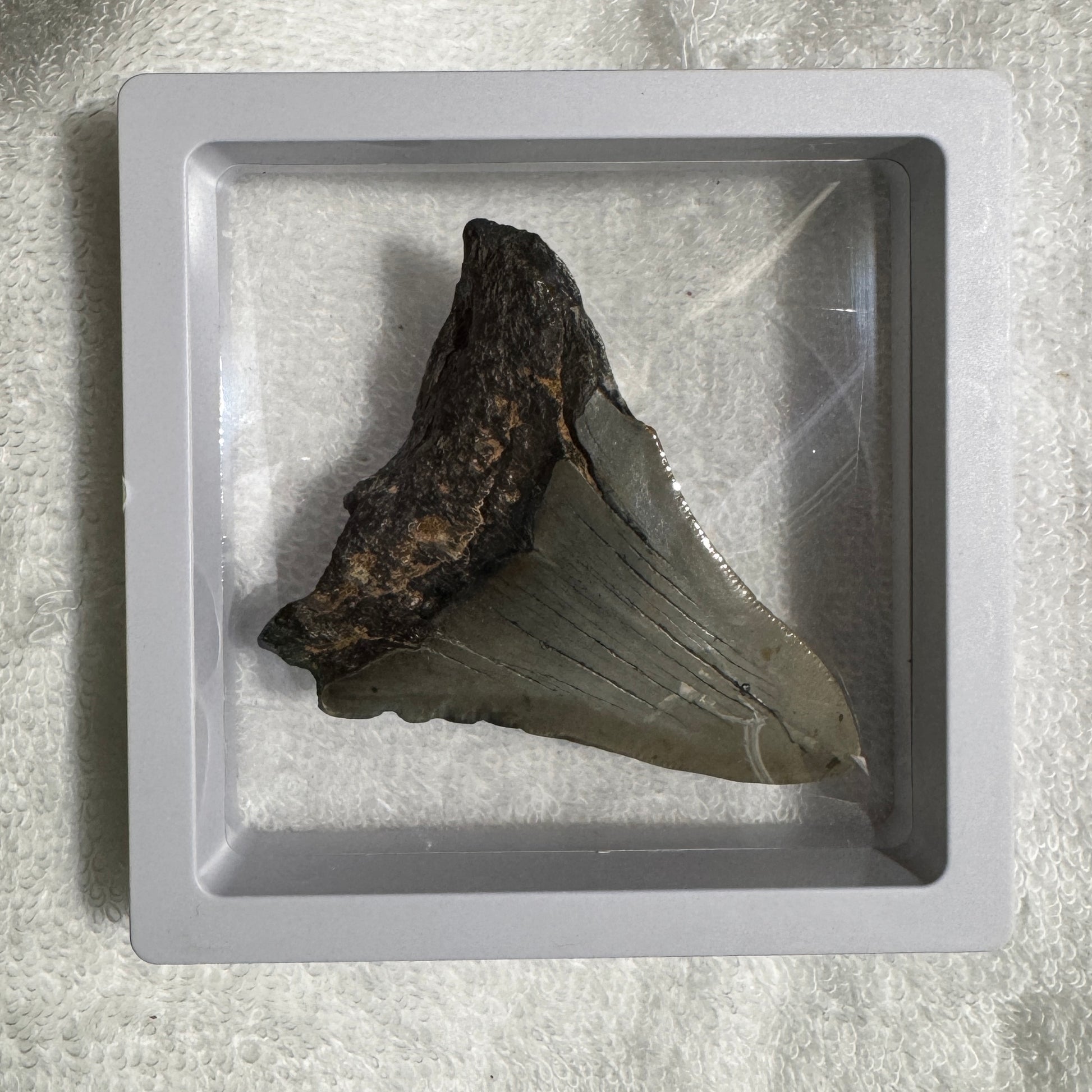 Megalodon tooth measures 72mm x 62mm x 28mm and weighs 75 grams.