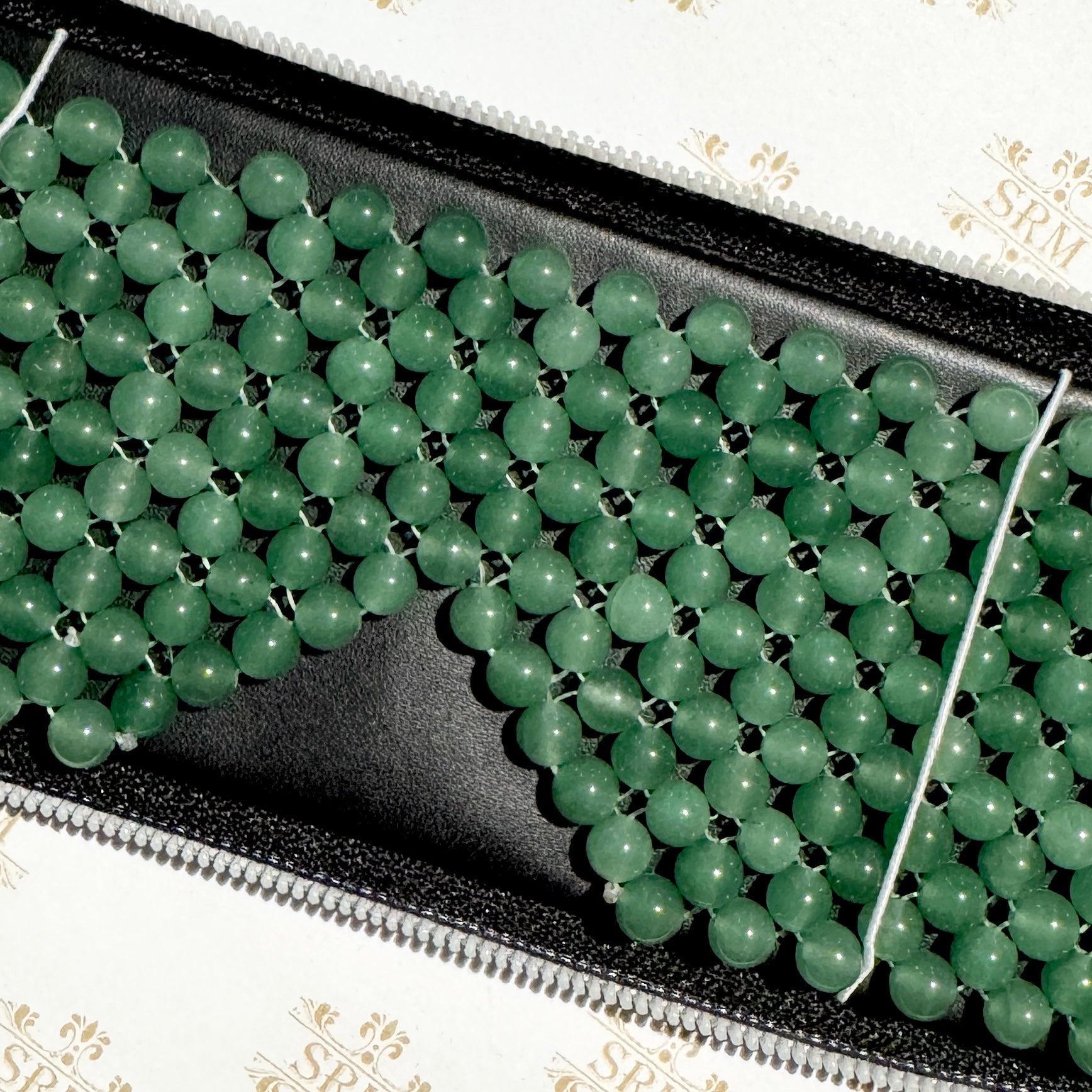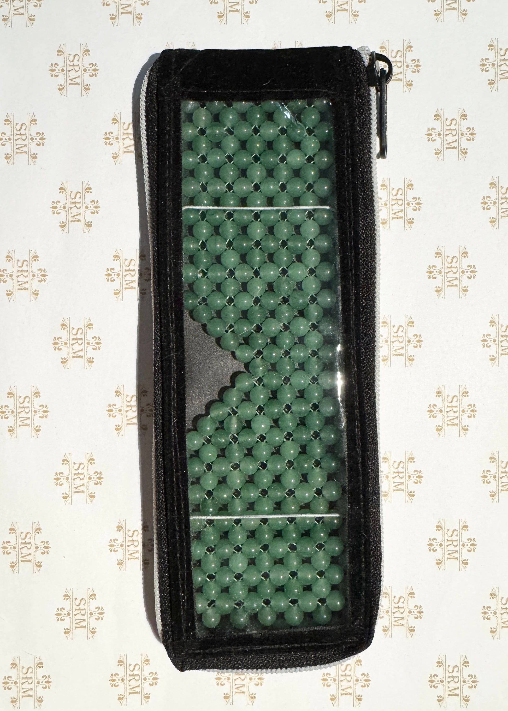 Meditation masks in Green Aventurine only variant and in Green Aventurine and Rose Quartz variant. Each mask is made of gemstone beads measuring about 6mm Each mask comes in its own zippered storage case.