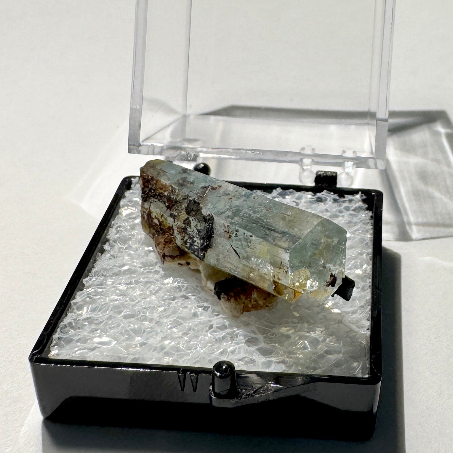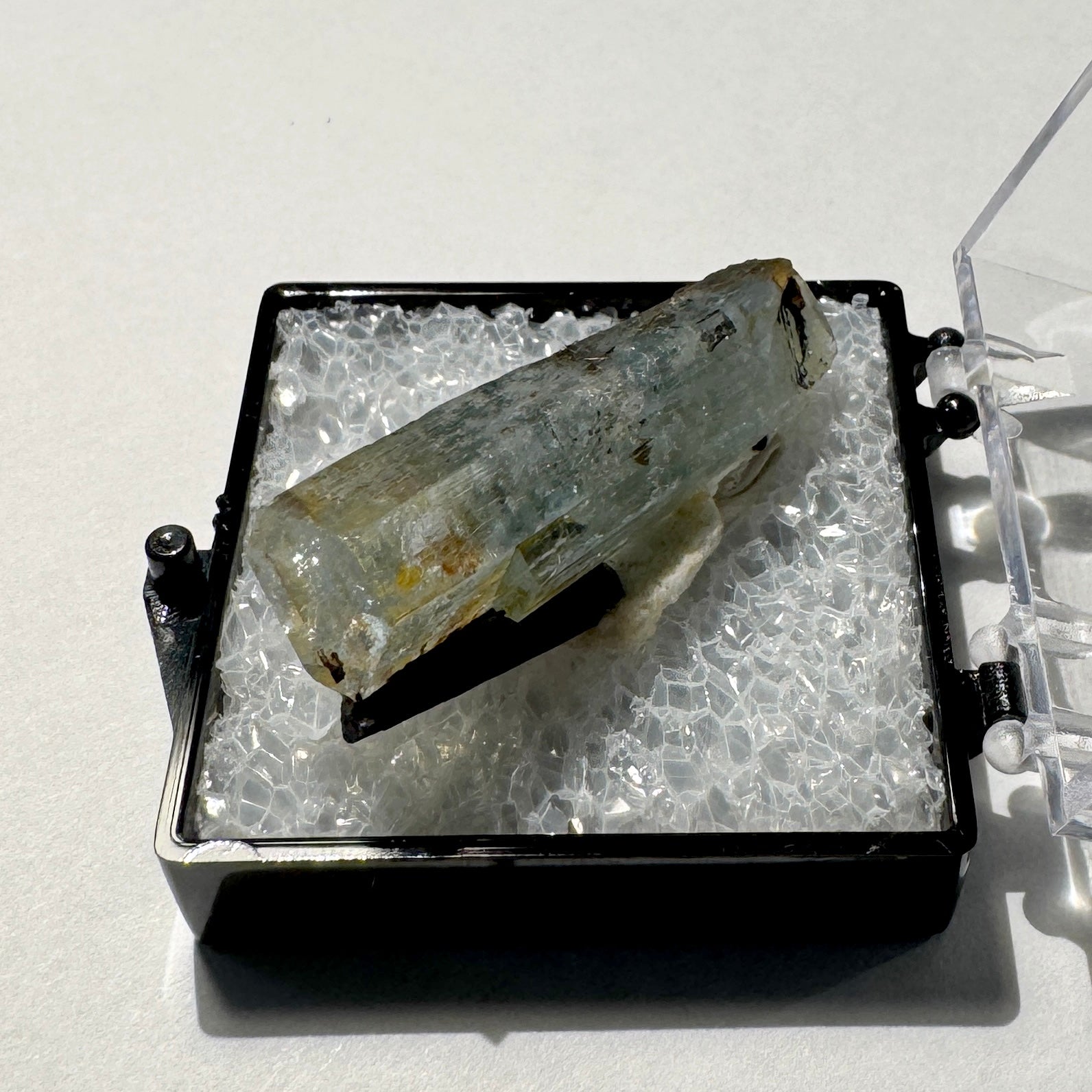 Natural Aquamarine, Shorl, Feldspar specimen from Namibia. Approximately 30mm x 8mm. 5 grams. Mounted in a 1.25" specimen box.