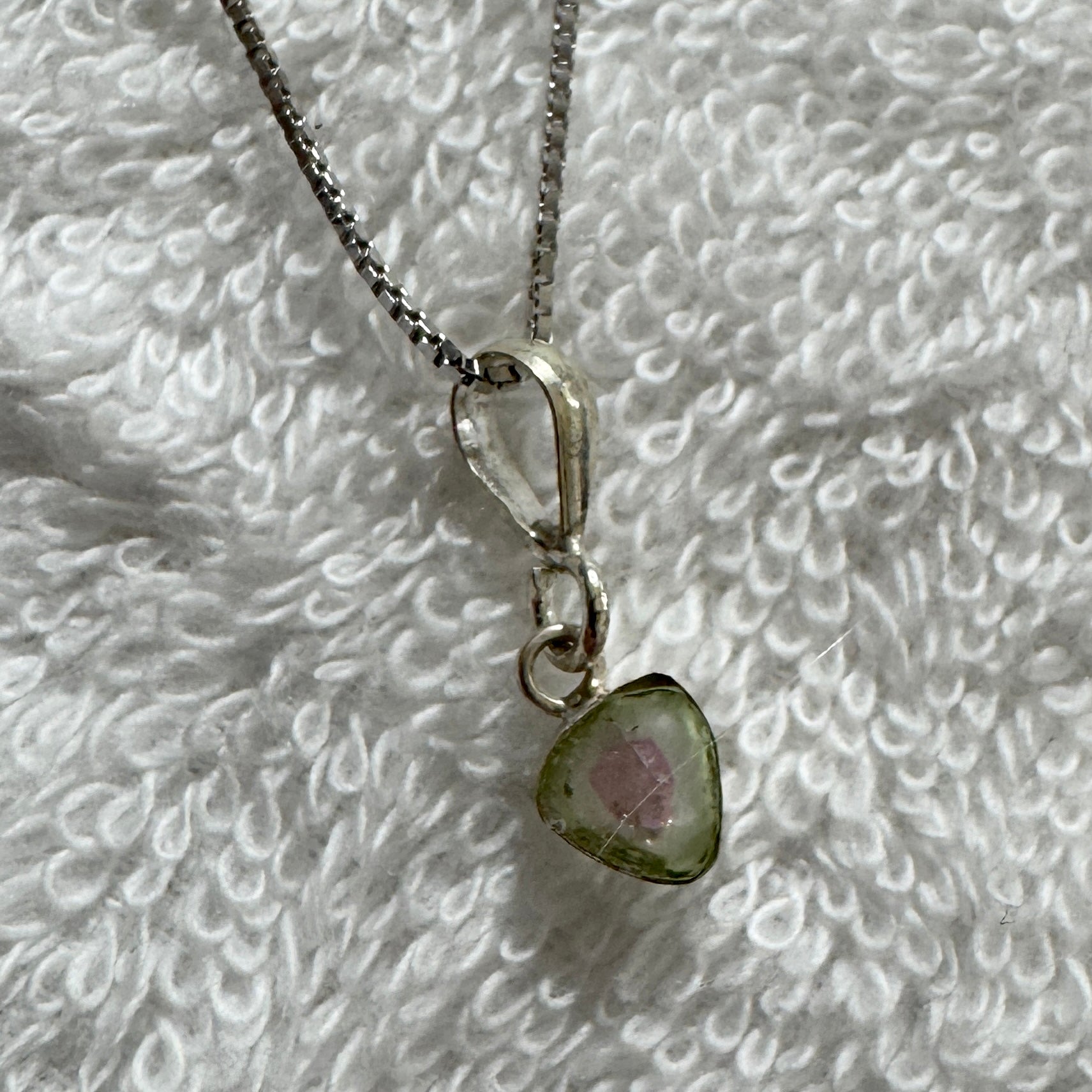 Pendant of Watermelon Tourmaline slice wrapped in Sterling Silver, measuring about 5mm to 6mm, hanging from a 15" Sterling Silver chain.