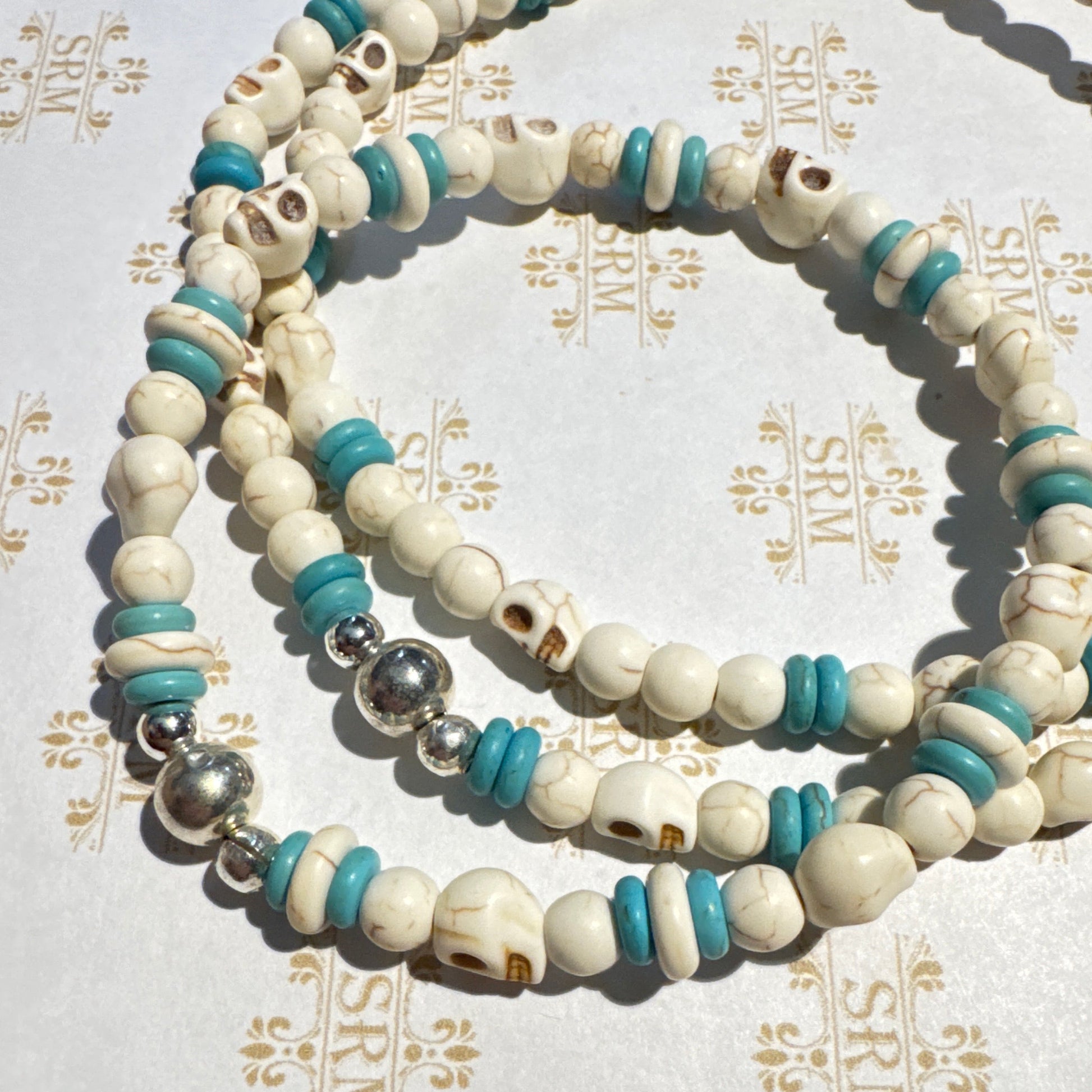 Handmade of 6mm Skulls and weathered beads with cyan spacers and an 8mm Silver-plated focal bead.