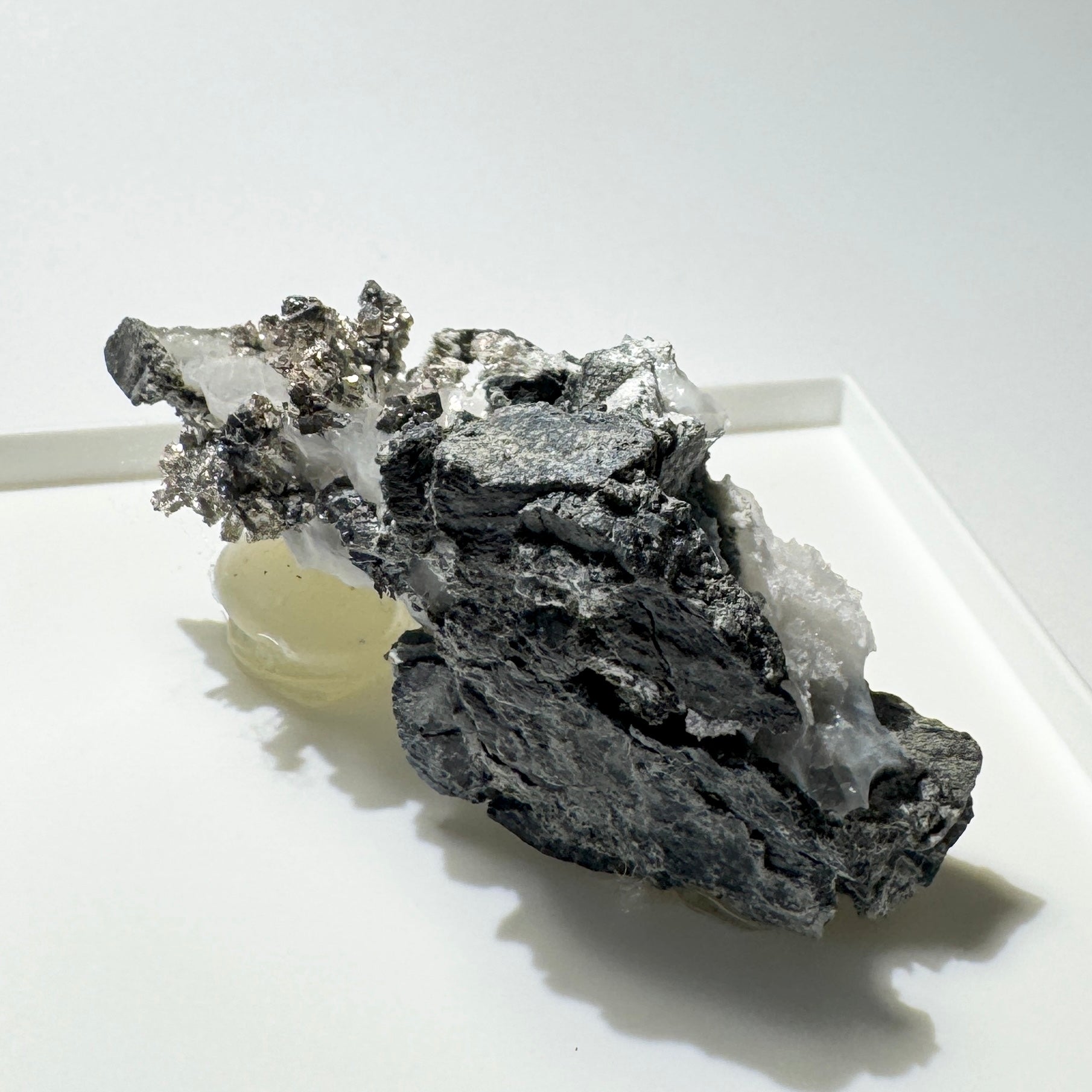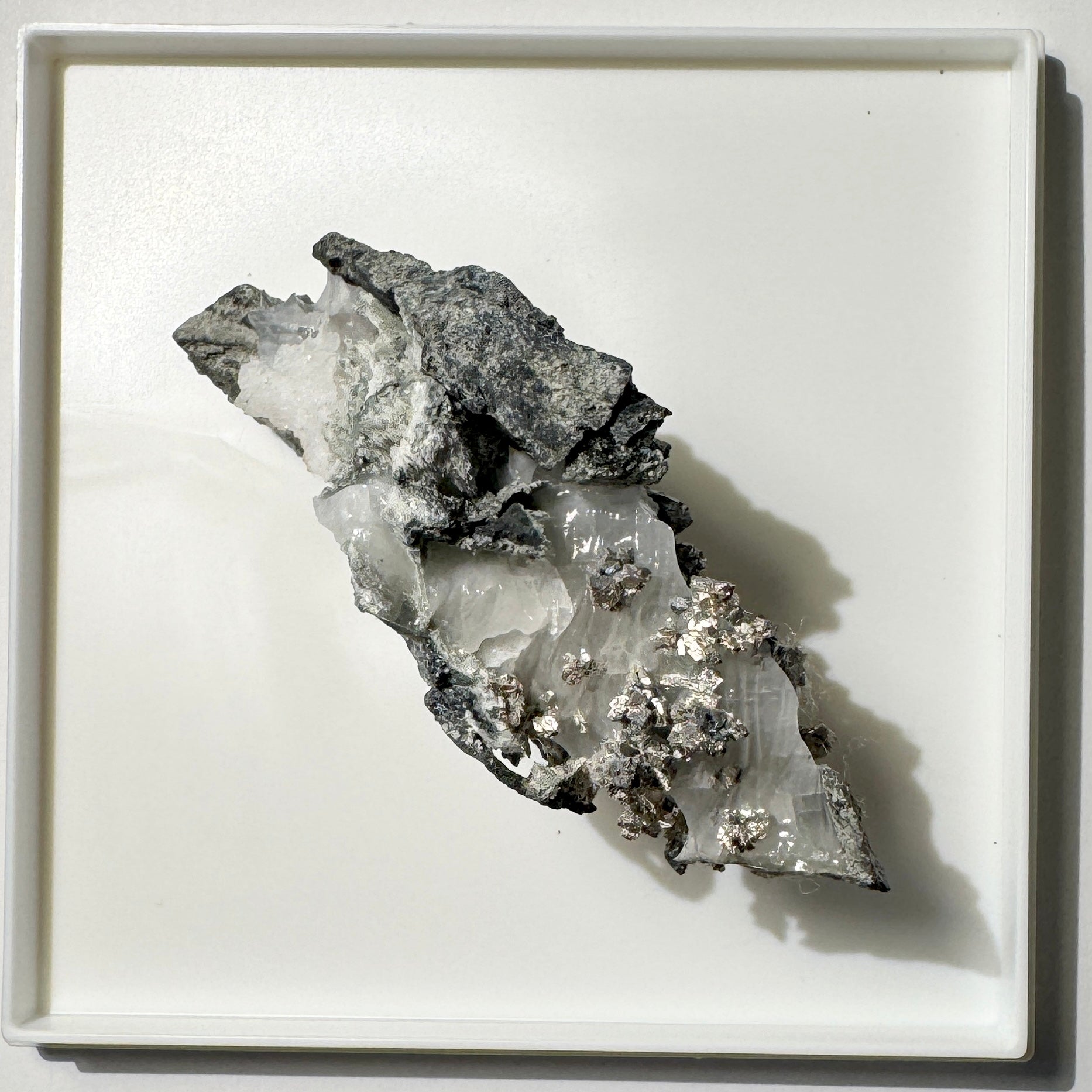 Beautiful Native Silver on Calcite specimen mounted in a 3" acrylic box.
