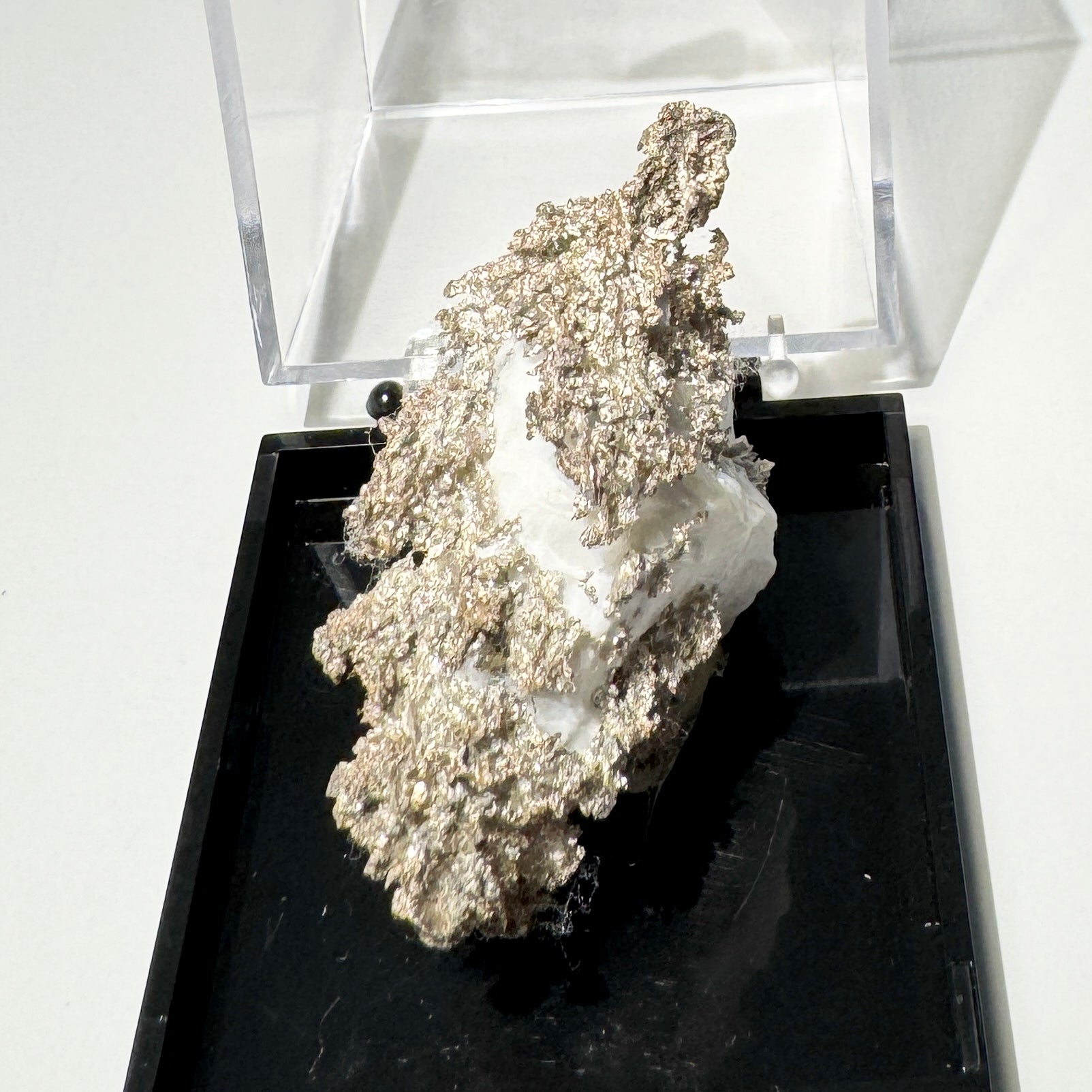 Beautiful Native Silver on Calcite specimen mounted in a 2" acrylic box.