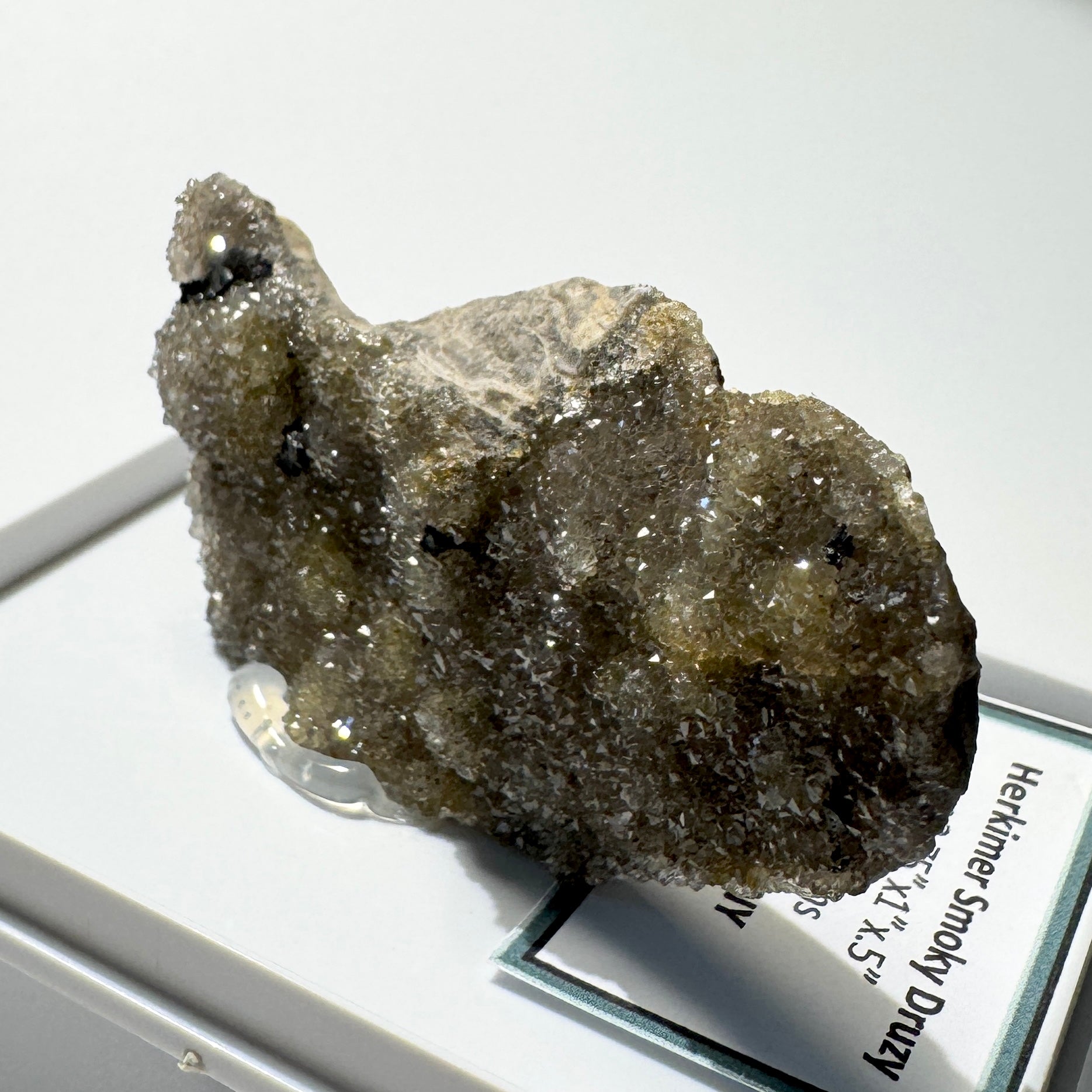 33g Herkimer Diamond smoky druzy specimen mounted in a 2"x3" acrylic box.